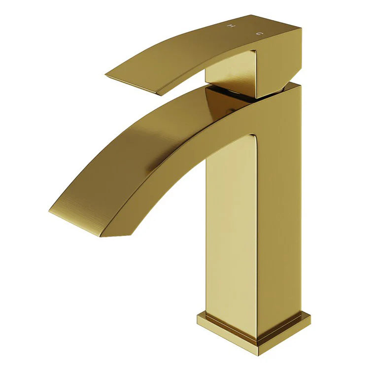 Variety of bathroom vanity faucets available in 3 different shapes in chrome, brushed nickel, brushed gold, and brushed black finishes.